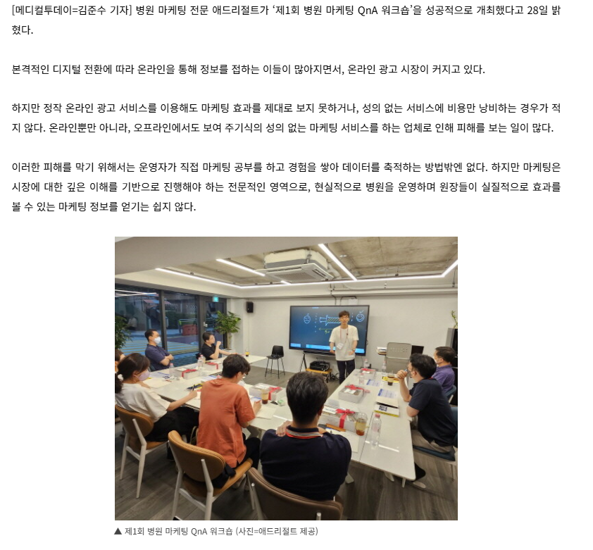 병원 마케팅 전문기업 애드리절트는 병원 원장들을 대상으로 ‘제1회 병원 마케팅 QnA 워크숍’을 개최하였습니다.